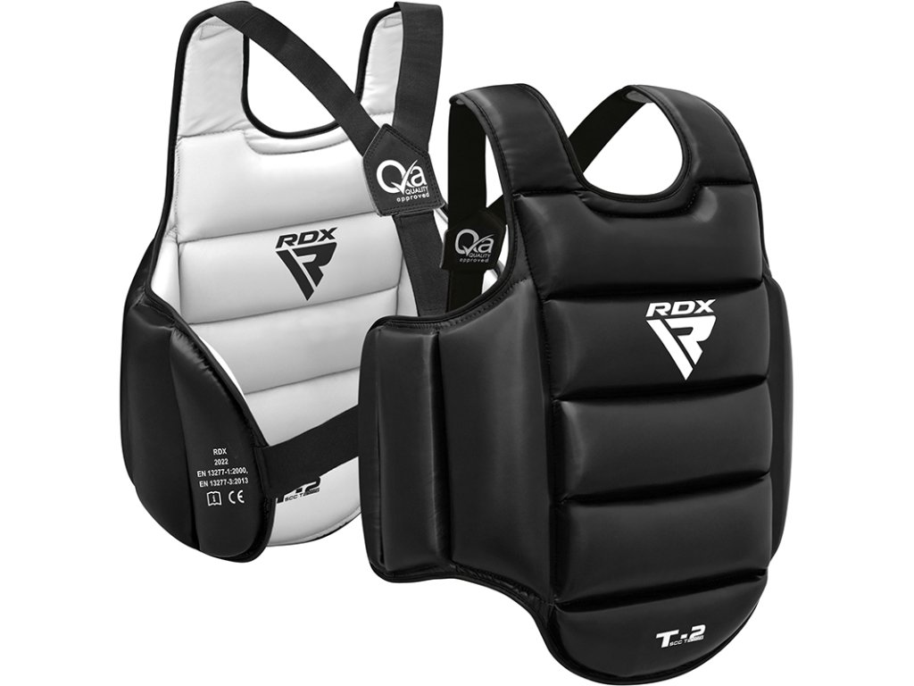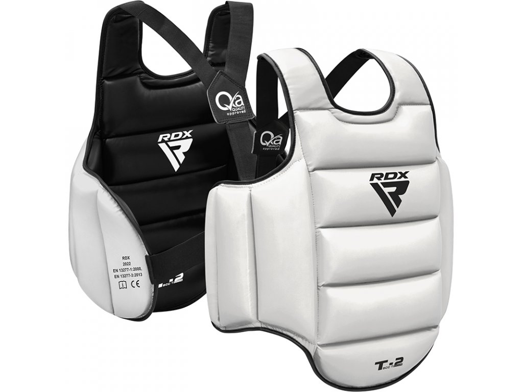 Chránič tela od značky RDX. Patentovaná koža Maya Hide zabraňuje opotrebovaniu. Tento hrudníkový chránič je ohybný, odolný a dlhotrvajúci, vyrobený zo super-stlačenej laminovanej peny, ktorá odolá akémukoľvek náporu. Neústupná a odolná koža Maya Hide je materiálom budúcnosti a takmer nezničiteľná. Hrudníkový chránič z kože Maya Hide je vyplnený tlmiacou penou Supremo Shock Foam na ochranu pred údermi v TKD. T-3 trojitý Nylonový steh s Nylonovým lemom zabezpečuje nezničiteľnú pevnosť. Dvojstranný dizajn umožňuje použitie v čiernej alebo bielej farbe.